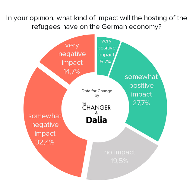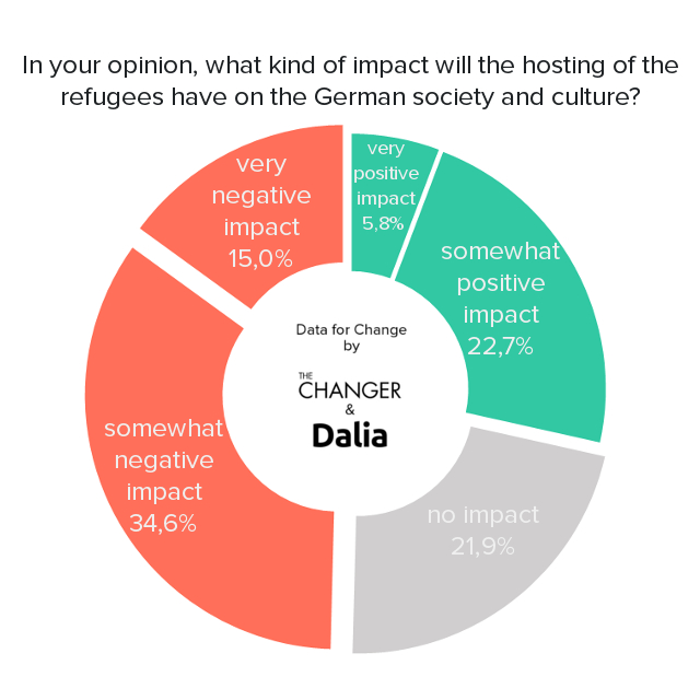 - Almost one-half of the population thinks that hosting refugees will have a negative impact on the German economy (47%) and culture (50%).